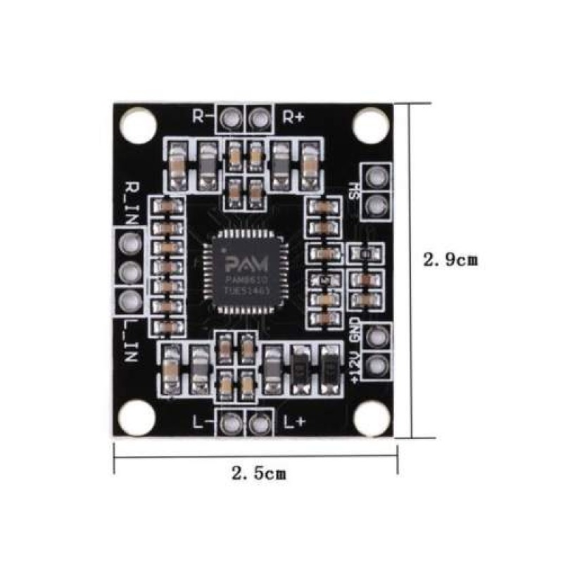 PAM8610 is a 12V Mini class D digital audio(power) amplifier board with 2 x15w Dual Channel Stereo output. It’s Highly efficient, 12V power supply Output’s 10W + 10W of power, the chip without heat sink has overheating issues, so heat sink is recommended, over-current protection function. The board has a switching function, the SW shorted turns off the power amplifier.