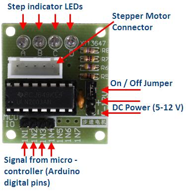 This is a 4 channel stepper motor driver module based on ULN2003 IC. This motor driver PCB provides a direct driver interface between your microcontroller and motor. The module provides 4 inputs for connection to your microcontroller, power supply connection for stepper motor voltage, and ON/OFF jumper, a direct connect stepper motor header, and 4 LEDs to indicate stepping state.
